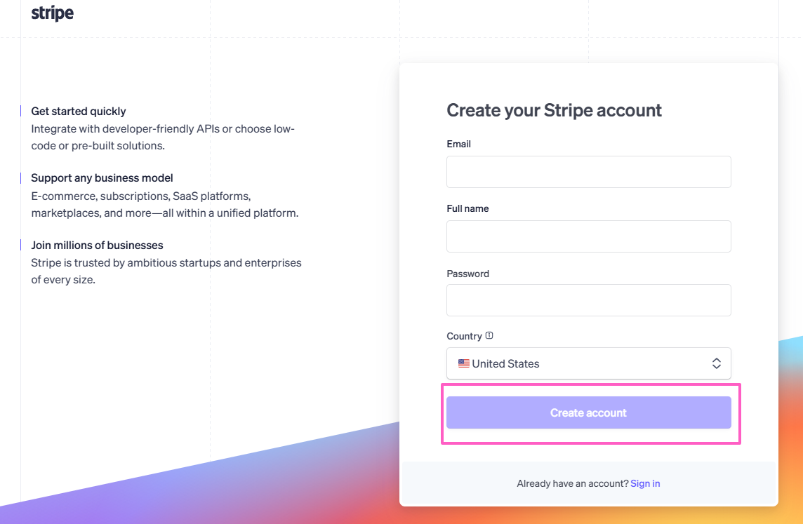 4. You’ll be redirected to Stripe’s website to complete the setup. Fill in your Email, Full Name, Password, and Country. Click Create account.